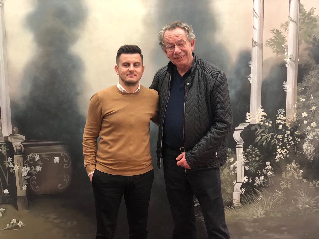 Lucjan Bedeni meets Michael H. Faber in front of a historical photo studio wall. ©: Marubi Museum